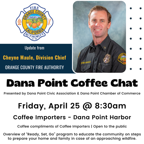 The Dana Point Civic Association and Dana Point Chamber of Commerce partner to host monthly Coffee Chats to provide the community local updates. Join us at Coffee Importers in the Dana Point Harbor on Friday, April 25 at 8:30am.
