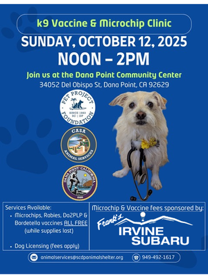 The San Clemente-Dana Point Animal Shelter will host a FREE Vaccination Clinic on Sunday, October 12 from 12-2 pm at the Dana Point Community Center.